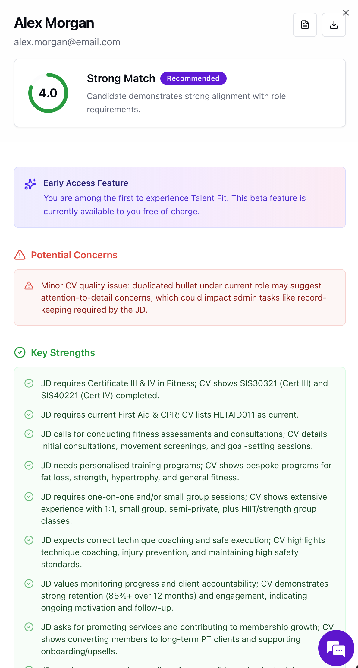 Alex, our AI Talent Assistant, adapts to candidate responses, asks intelligent follow-up questions, and captures deeper behavioural insights than static forms or questionnaires.