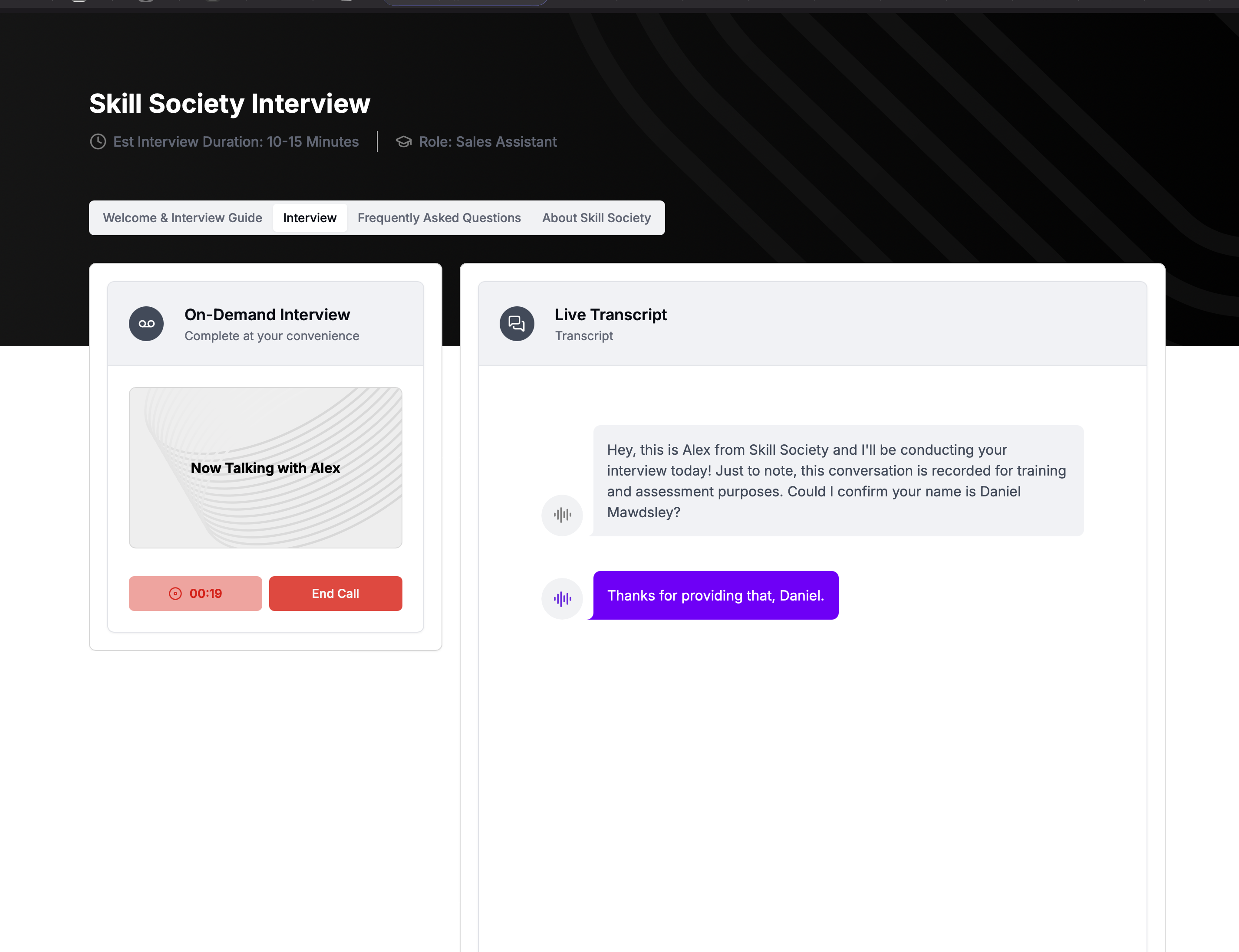 Interviews are voice based, mobile friendly and available 24/7.