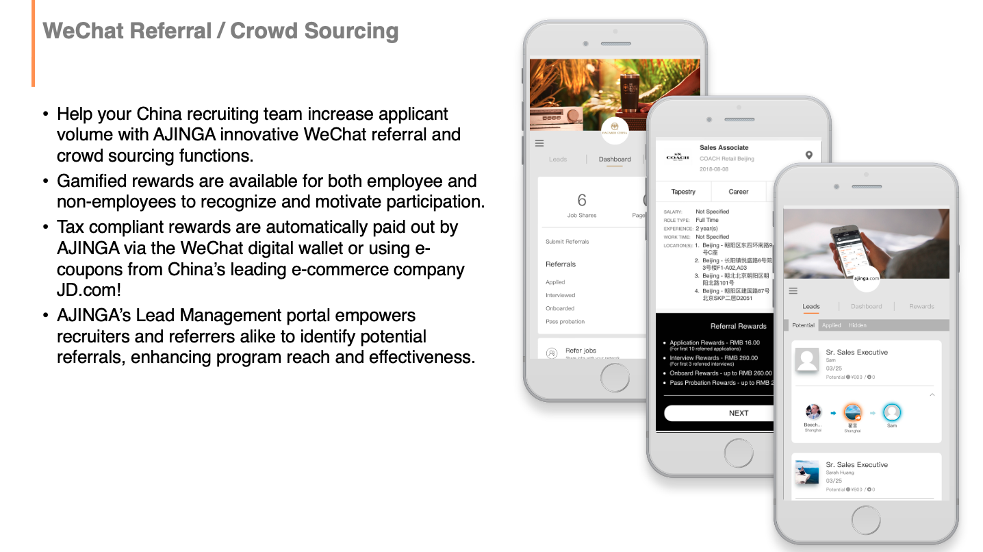 2.WeChat Referral: WeChat is China’s largest social media channel and perfect for facilitating employee referrals. The AJINGA WeChat referral system helps your clients facilitate quick and easy referrals through WeChat and may include gamified rewards management and rewards distribution using the WeChat wallet function. This fully tax compliant local solution is also able to be used for non-employee (crowd sourcing) referral management too!