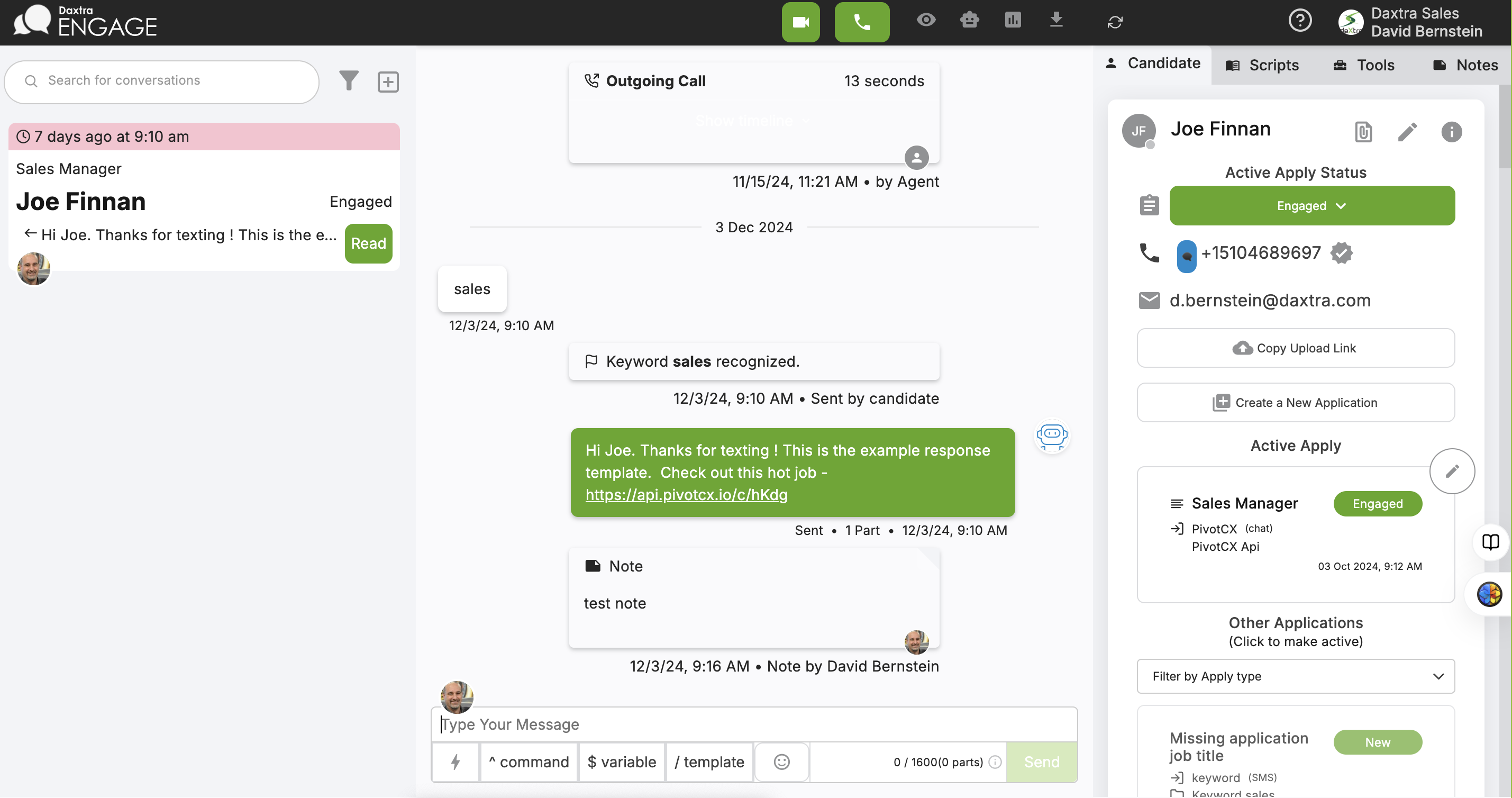 Daxtra Engage is a communications hub designed for recruiters and HR teams to streamline candidate engagement via SMS/RCS, WhatsApp, voice, video and email. It integrates seamlessly with ATS, CRM, job boards, and HRIS systems. By enabling personalized, real-time communication, Daxtra Engage ensures candidates and employees feel engaged throughout the hiring process.