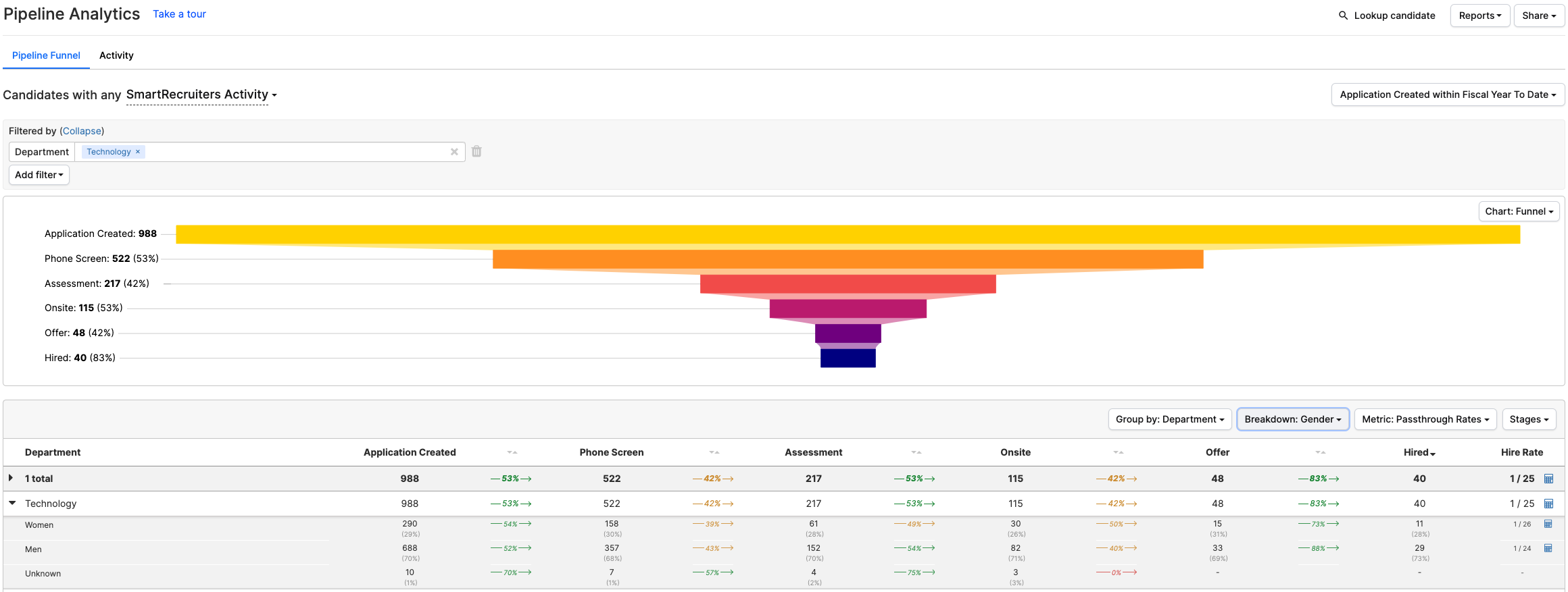 - Optimize passthrough rates and time to hire with the ability to drill down on specific jobs, departments, source types, etc.