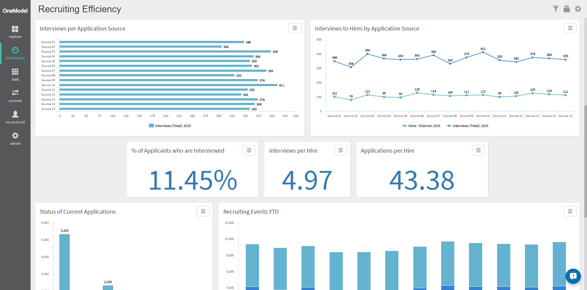One Model provides a comprehensive suite of recruiting analytics directly from SmartRecruiters to measure all aspects of the recruiting process. Use our out-of the-box metrics, analytics, and dashboards or create your own as you need to. We provide a full platform for delivering more information, measurement, and accountability from the Talent Acquisition team.