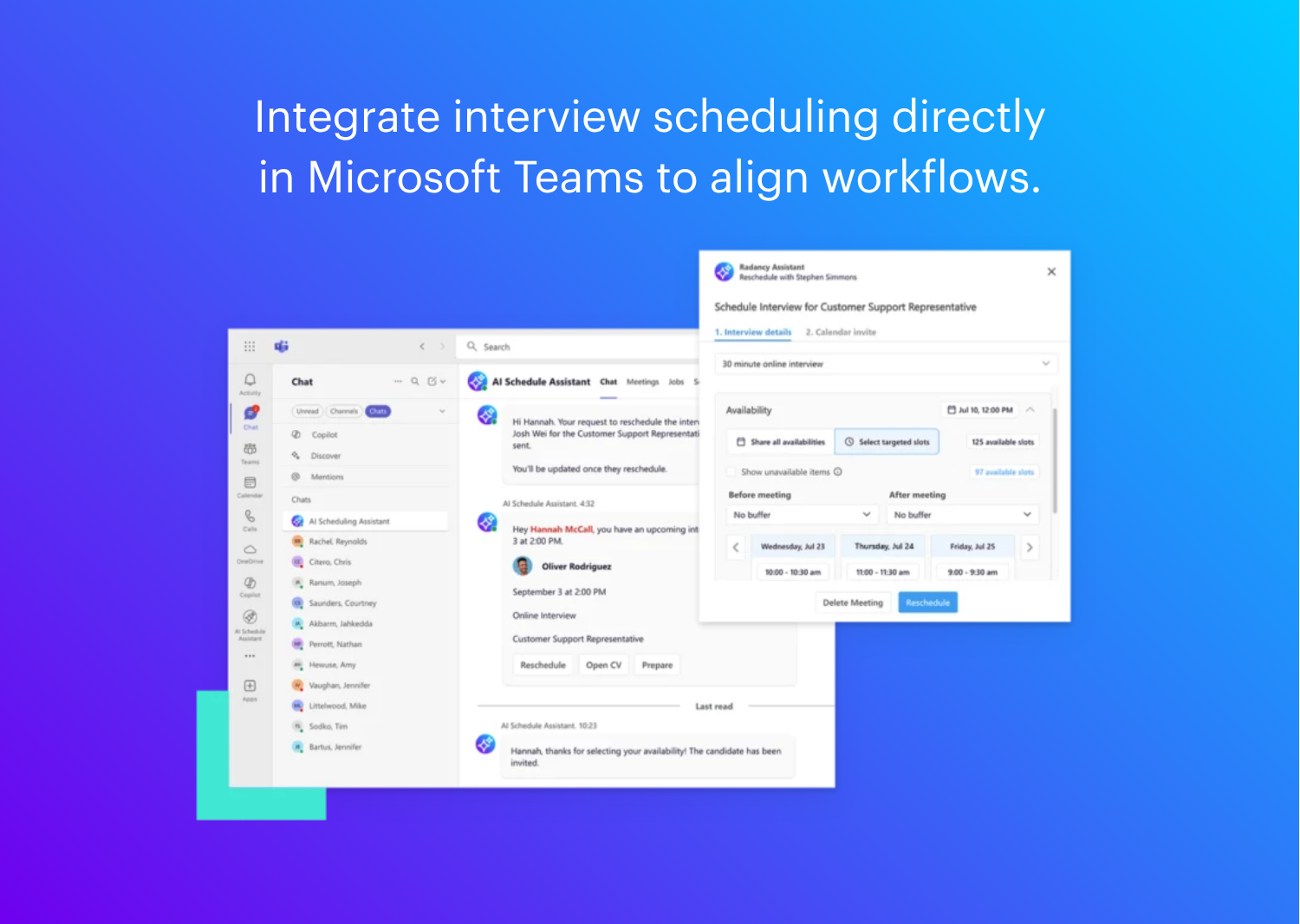 Integrate interview scheduling directly in Microsoft Teams to align workflows.