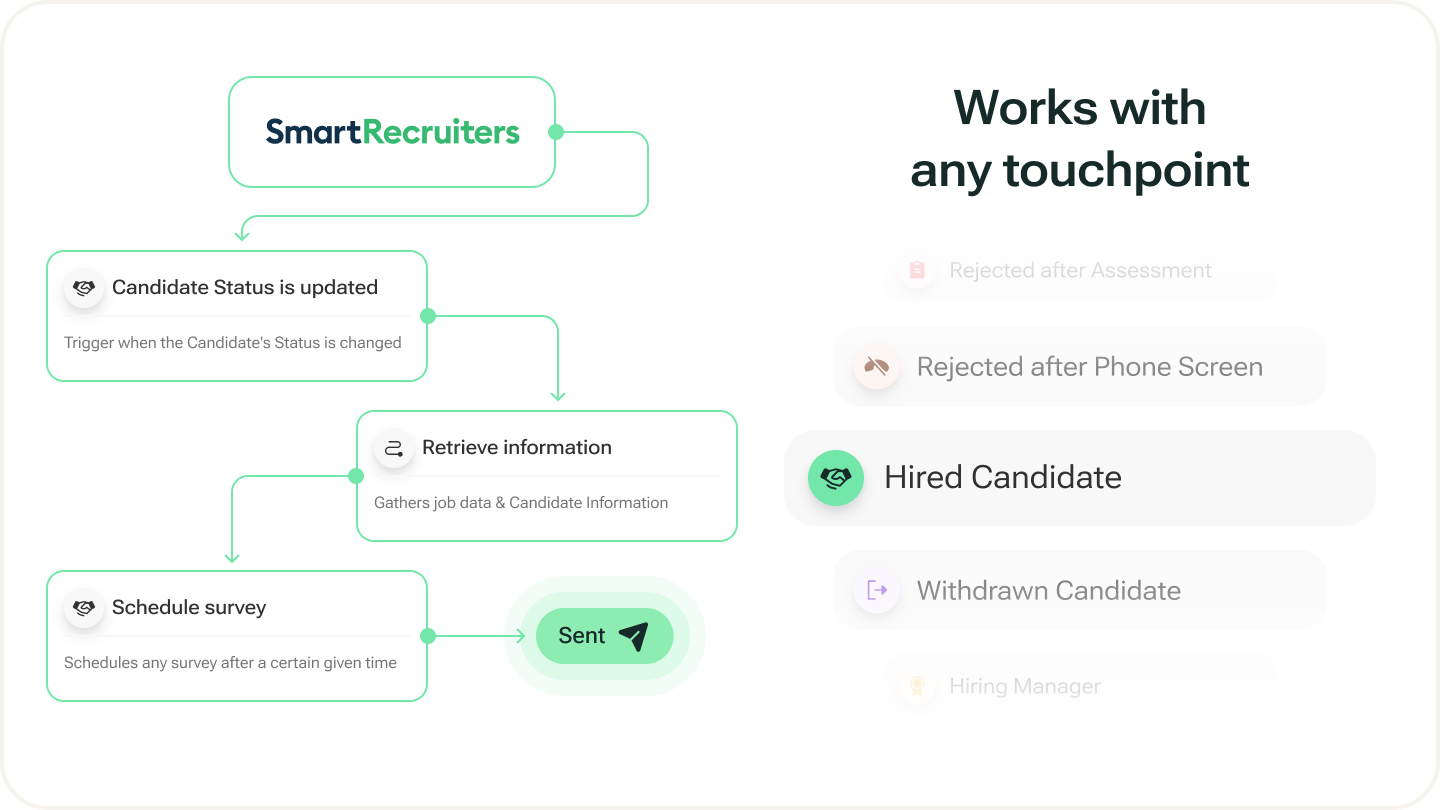 - Send surveys to rejected, withdrawn, and hired candidates, as well as hiring managers and recruiters, at any stage of the process.