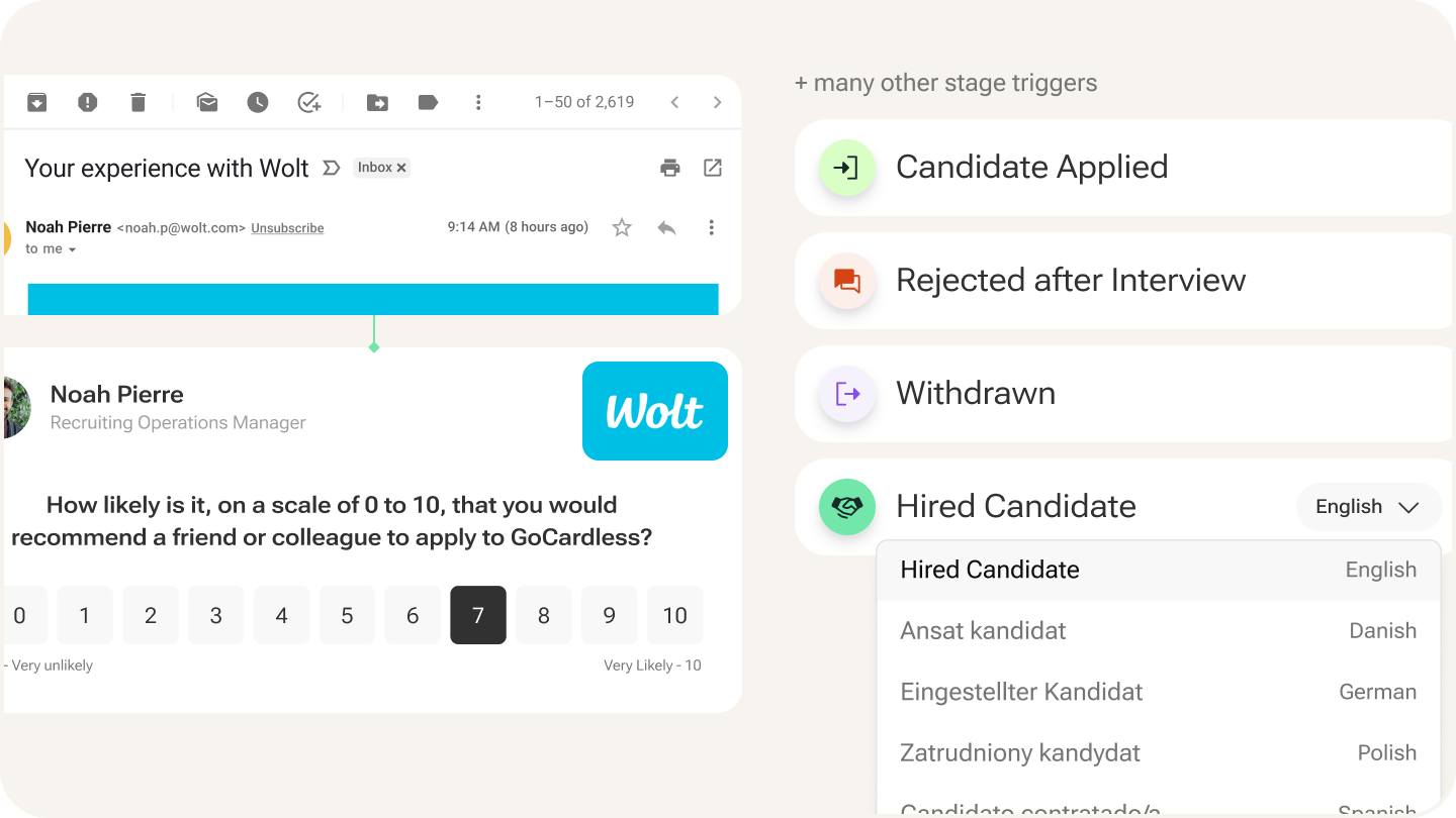 With the no-code integration, send automated and personalized surveys to the right stakeholders at the right time. Fully customizable to match your brand, use our email invitations to boost response rates, engage with candidates and enhance the Candidate Experience from day one.