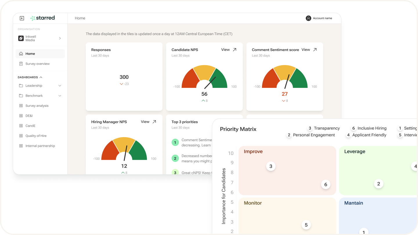 Starred’s intelligent dashboards let you analyze feedback by recruiter, department, job, location and much more, so you can focus on what matters most. Join Starred’s global community of data-driven companies to benchmark performance, unlock insights with Comment Analysis, and build action plans with the Priority Matrix.