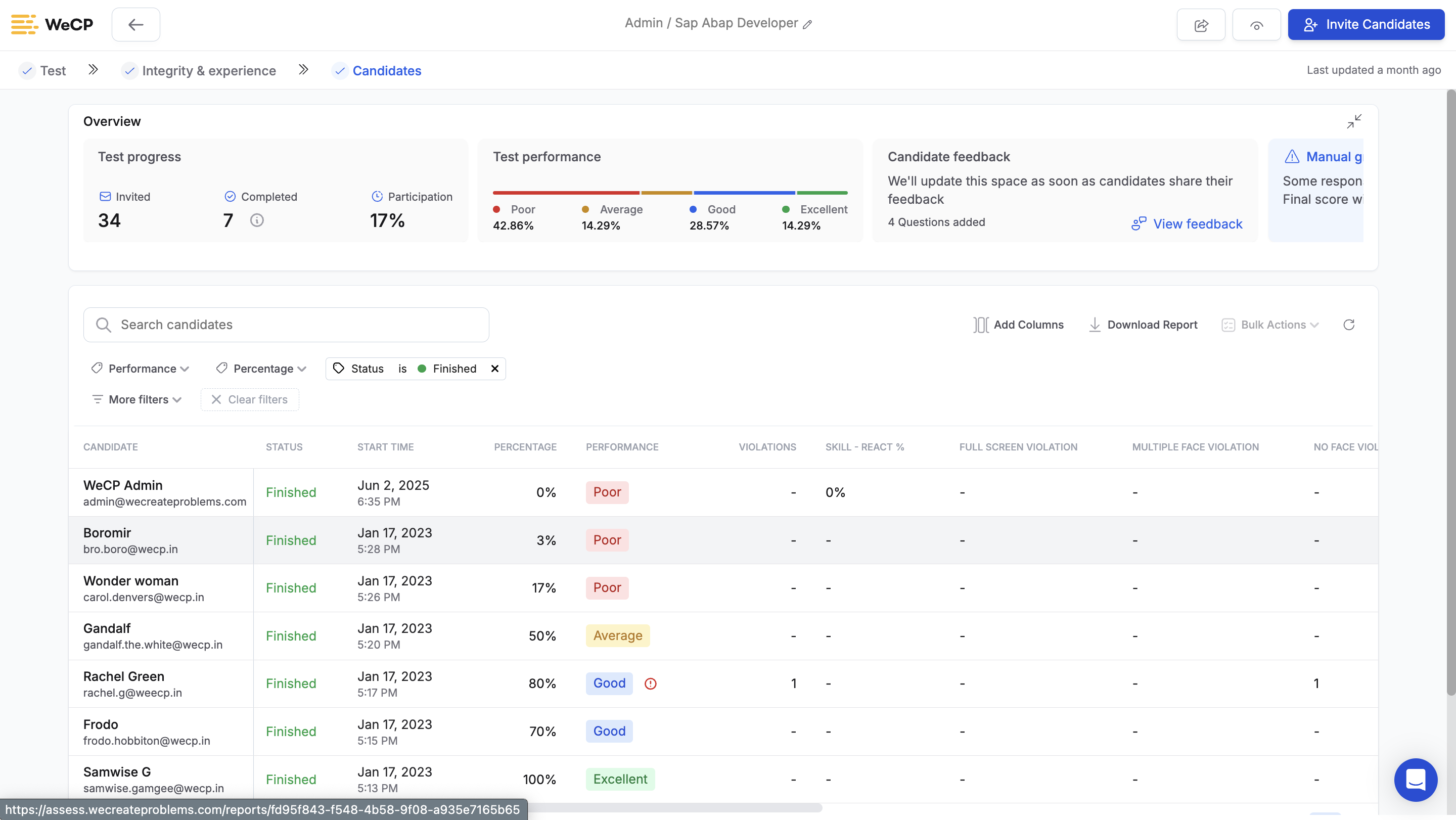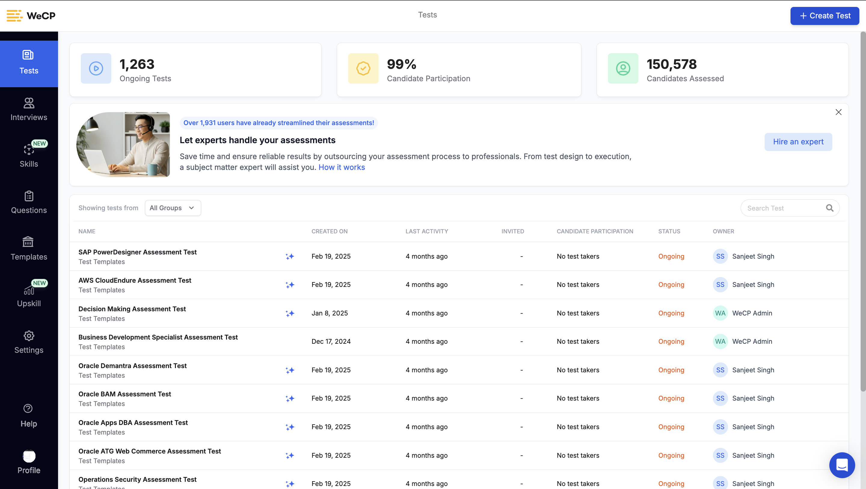 Beyond testing, you can run live technical interviews, track candidate progress, and receive detailed reports that highlight skills, strengths, and areas for improvement. This means you’re not just screening résumés. you’re evaluating real ability. Whether you’re hiring for software engineers, sales rep, or niche technical roles, WeCP helps you streamline your workflow, cut down hiring time, and confidently select the right talent.